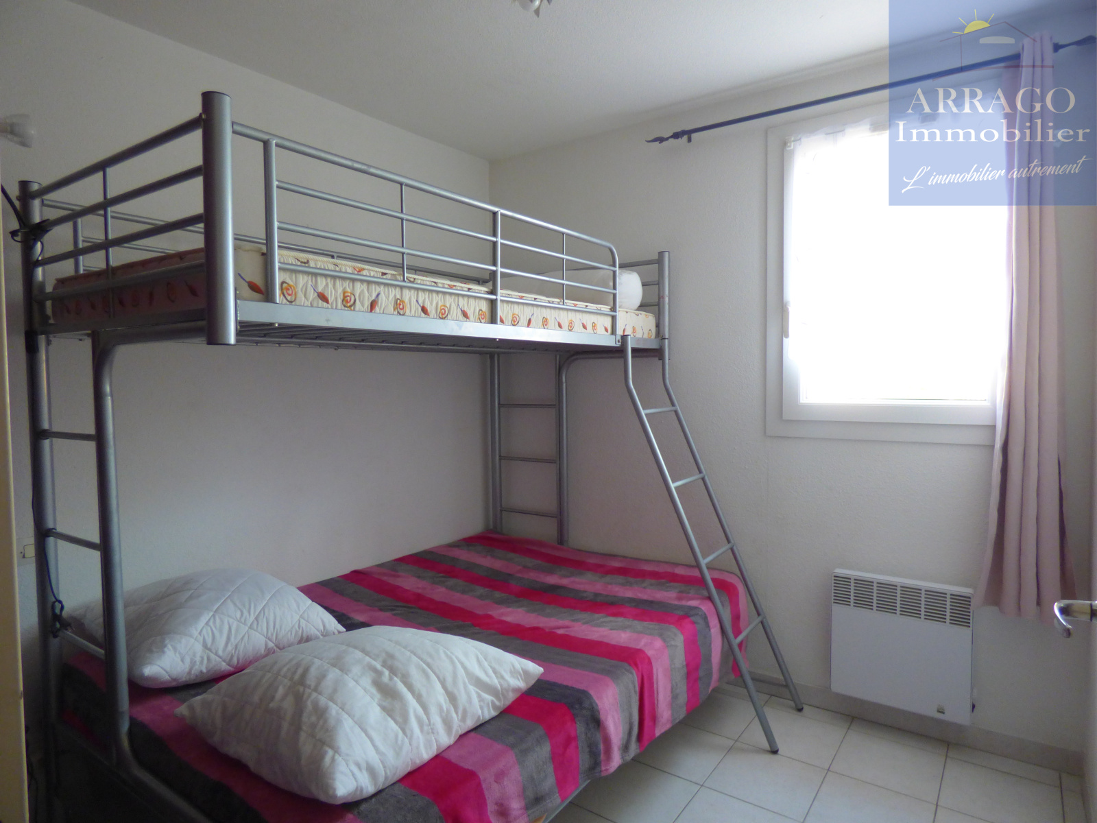 Equipements : Climatisation réversible, TV écran plat, lave linge, lave-vaisselle, frigo/congélateur, four électrique, micro-ondes, plaques électriques 4 feux, hotte aspirante, bouilloire, grille-pain, cafetière, Senseo, table et fer à repasser, sèche cheveux, barbecue électrique, aspirateur, parasol, 2 transats, table et chaises de jardin. Couchages pour 5 personnes : 1 lit 140cm et 1 lits superposés 90cm et 140cm.