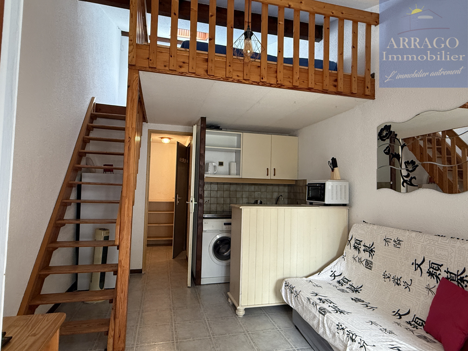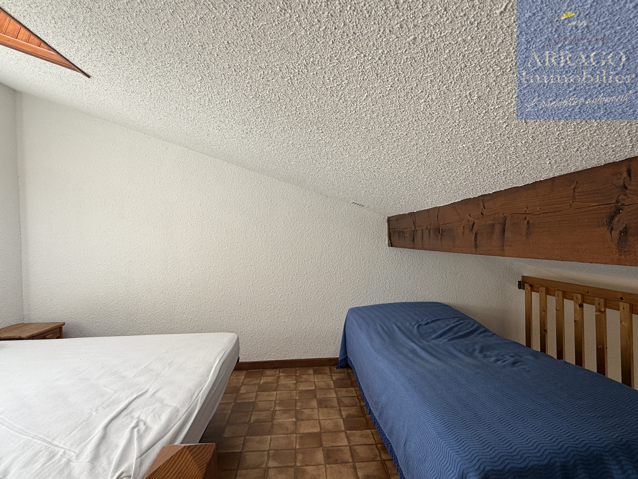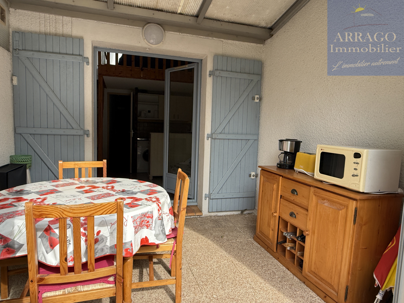 VALRAS PLAGE, dans une résidence sécurisée avec piscine collective, "LOU PORTALOU", pavillon composé d'un séjour avec kitchenette, une salle d'eau avec wc, rangements nombreux, une mezzanine avec vélux (chambre), une loggia et une terrasse avec accès direct à la piscine. Une place de parking privative.