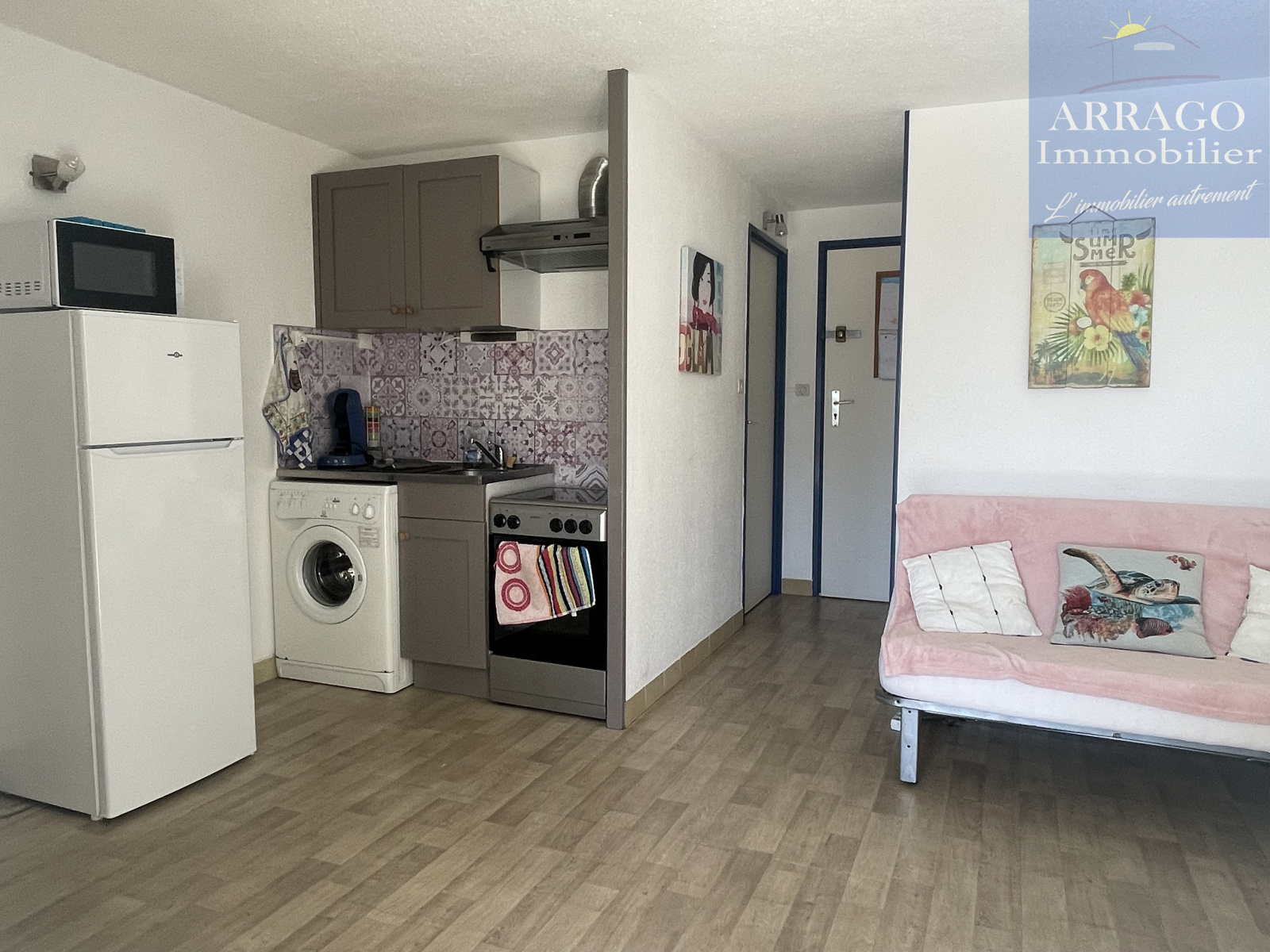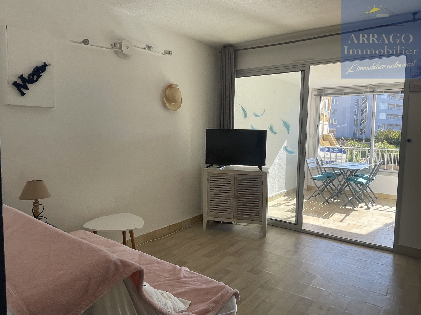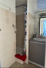 VALRAS PLAGE, dans une résidence sécurisée avec piscine collective, appartement de type 2 d'une surface de 23m² habitables au premier étage sans ascenseur, composé d'un hall d'entrée avec placard donnant accès à la pièce de vie avec kitchenette, une cabine, salle d'eau et wc séparé ainsi qu'une lumineuse loggia exposée sud avec vue sur la piscine.